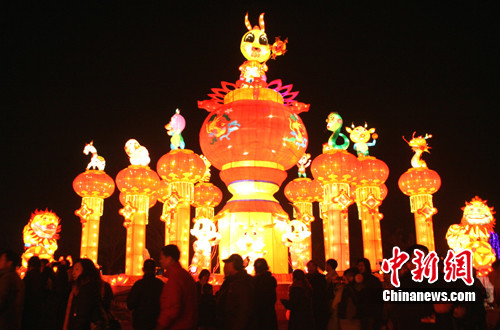 29日,“神龙跃两岸,盛世共和谐”2011江苏(扬州)灯会在扬州瘦西湖畔宋夹城正式亮灯迎客。图为扬州灯展区主灯“玉兔送福,群狮贺岁”,集声、光、电、控于一体,充分体现低碳理念和扬州灯彩的特色 崔佳明 摄