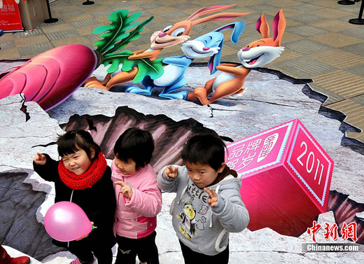 1月22日,一幅长约2.5米、宽约2米,以三只小兔拔萝卜为题材的3D立体画在福州宝龙城市广场亮相,形象可爱,造型逼真,吸引了许多市民尤其是小朋友的关注。随着中国农历新年的临近,十二生肖中的小兔子成为市民的新宠。张 斌 摄 图片来源:CNSPHOTO