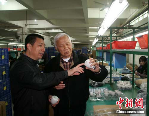 2月15日,在东山椿益塑胶制品有限公司生产车间,72岁的台商、公司副董事长吕文吉先生 (右)与技术员忙着严把产品质量关。