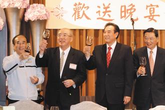 国民党荣誉主席吴伯雄(左二)昨晚设宴欢送海协会会长陈云林(右二),与“立法院长”王金平(左一)、海基会董事长江丙坤(右一),一同举杯。