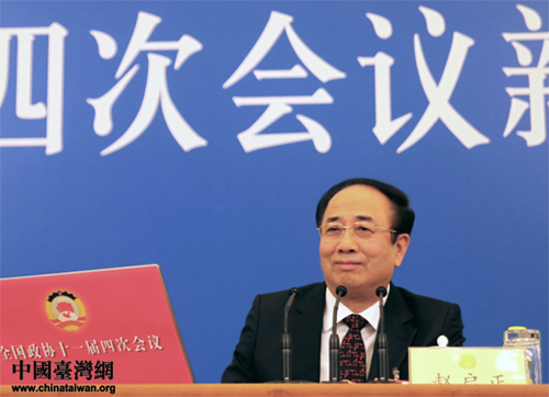 3月2日15时,全国政协十一届四次会议新闻发布会在北京人民大会堂三楼金色大厅举行,大会发言人赵启正介绍会议情况,并回答记者的提问。(中国台湾网 陈佳慧 摄)