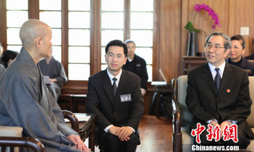 4月24日,广西壮族自治区主席马飚率经贸文化代表团访问花莲县,并拜会台湾慈济创办人证严法师,对慈济向广西灾区曾经捐赠救灾物质表示感谢。中新社发 沈存旭 摄