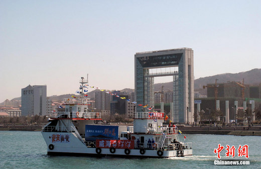 台湾梅花鹿和长鬃山羊16日抵达威海机场,随即经紧凑的陆地、海上运输登上刘公岛。图为专门搭载两对“宝贝”的登陆船行进在威海湾。刘舒凌 摄