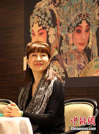 梅派京剧大师梅葆玖将于5月赴台北,与他的第一位台湾入室弟子、如今的台湾京剧名旦魏海敏同场献艺,为台湾戏迷奉上经典梅派戏码。图为魏海敏在4月26日举行的记者会上介绍演出相关情况。中新社发 路梅 摄