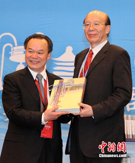 应台湾大学邀请,校长周其凤率北京大学134人代表团访问台湾,展开北大历史上规模最大的校际交流活动,并于9日在台大开展“北京大学日”系列活动。图为周其凤(左)与台大校长李嗣涔(右)互赠图书。中新社发 路梅 摄