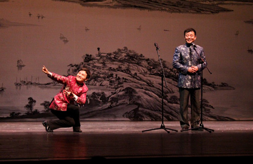 国家一级相声演员李伟建、武宾表演的相声《天天习舞》以说唱结合的表演方式,形象生动的肢体动作,让在场观众无不前仰后合,拍手叫好,两度返场演出,让本是同根同源的两岸文化交流没有任何距离。应宁、王磊表演的对口相声《讲四书》以风趣幽默的表演方式,融入当地语言元素,充分展现了中华民族的文化魅力。刘颖、浩楠表演的相声《减肥》以反讽的方式结合热点话题,用诙谐幽默的语言,既愉悦了观众又展示了中华民族的语言魅力。这些精彩的语言艺术表演,让当地民众更直接了解中华民族传统文化,感知两岸亲情,认同同根同源。北京杂技团的《女子双人柔术》运用各种“顶”的技巧和“连续软翻”、“双人造型”等优美动作征服了在场的每位观众。年轻魔术演员王璐的魔术《伊人花影》,如梦如幻,也为台湾观众留下了深刻的印象。台北曲艺团的快板演员林文斌也同台献艺,表演了快板《武松打店》。