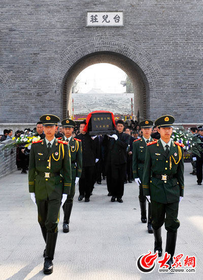 上午9时,台儿庄城区内防空警报长鸣,位于古城西门墙内北侧的起骸处,花圈环绕,人群肃立。伴随着高昂的《大刀进行曲》,8名青年代表将盛放烈士遗骸的灵柩缓缓托起,在4名武警战士的正步引领下走向城门外。灵柩车前,哀乐低回,时光把民众的思绪带回到74年前。