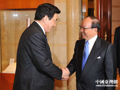 中共中央政治局委员、北京市委书记郭金龙21日下午会见了出席第15届京台科技论坛暨2012北京台湾名品博览会的中国国民党副主席蒋孝严一行。国台办主任王毅一同参加会见。(北京台办丁磊 摄)