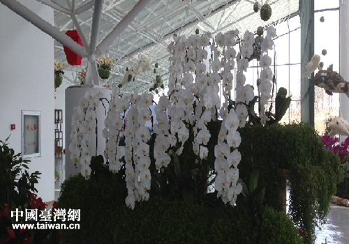 在二区,来自台湾的花艺师钟珮淇介绍道:“台湾是著名的兰花王国。在这里,我们以闻名世界的蝴蝶兰作为主要元素,以花艺融入景观的创作,力求呈现完美的花、艺、景合一的效果。”他指着其中的一种白色兰花说:“这个品种的蝴蝶兰名为‘台湾阿妈’,是台湾最珍贵的兰花品种,曾为台湾荣获过第一个国际兰花金奖,现在已有70%的台湾兰花都是从这个品种繁育出来的。”