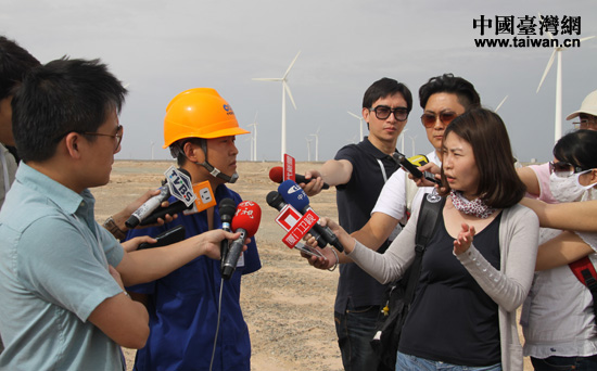 张亮在瓜州风电基地接受台湾记者采访(中国台湾网 王文英 摄)