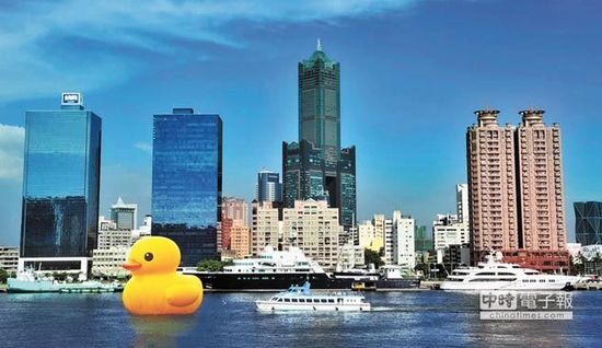 高雄版大黄鸭预定9月19日至10月20日在高雄港光荣码头展出。图为台媒合成照