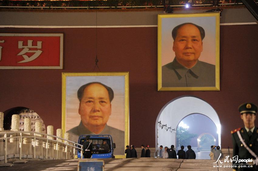 2013年9月28日零点,天安门城楼开始了一年一度的更换新的主席像工作。工作人员用吊车把旧的毛主席画像徐徐钓了下来,再把新画像吊起来固定在了城楼正中央。整个安装过程仅用了一个小时。陆岩 摄 图片来源:人民网
