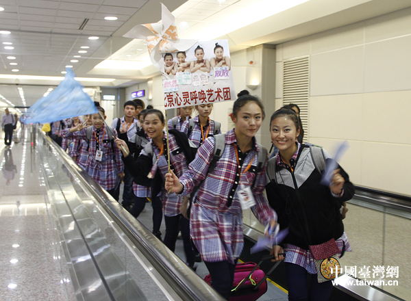 第六届中华文化快车--北京心灵呼唤艺术团交流团一行,10月5日飞抵台北,正式开启两岸中华文化交流台湾之旅。图为艺术团团员抵达桃园机场,难掩兴奋之情。(中国台湾网 普燕 摄)