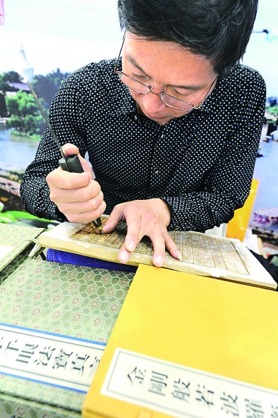 海峡两岸图书交易会现场,专业人员展示雕版技艺。CFP