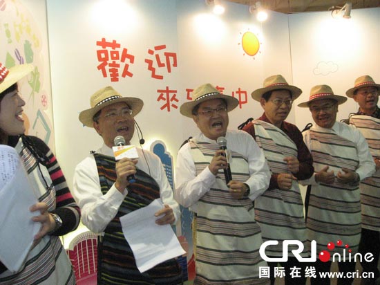 蔡炳坤(左2)与团队其他成员,身着泰雅族传统披肩,戴着大甲蔺草帽,高歌迎宾曲“梨山痴情花”,全力行销台中特色