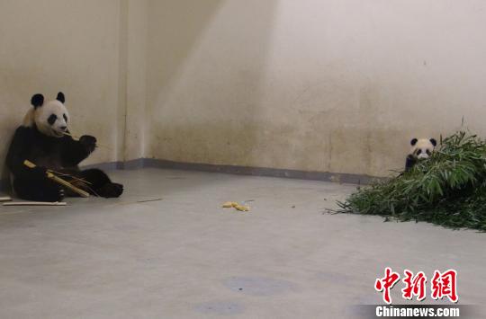 图为“圆仔”咬竹叶,妈妈“圆圆”在吃晚餐。 台北市立动物园供图 摄
