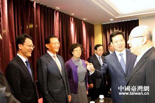 青岛市委李群书记在台北向吴伯雄荣誉主席介绍青岛团中的企业家。