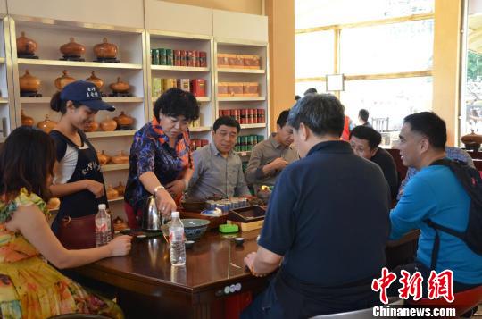 游客在台湾美食工艺品馆开心地泡茶。(刘雨 摄)