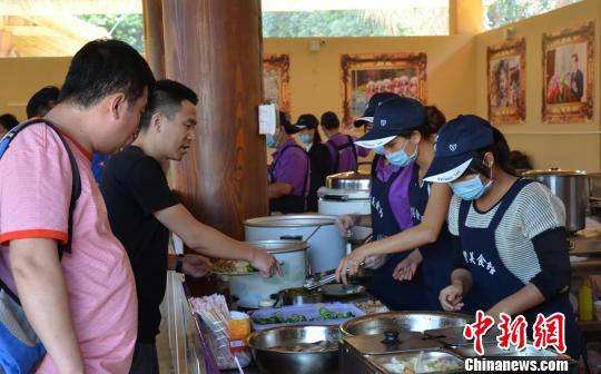 游客在台湾美食工艺品馆品尝台湾小吃。(刘雨 摄)