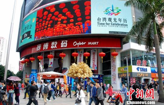2月15日至28日,在深圳华强北赛博广场及东门金世界百货外的两块大型户外LED屏幕,民众可看到以“台湾观光年历”各式节庆活动为主题的赴台游相关宣传信息。