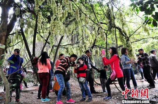 广东东莞清溪镇第四届赏花行16日拉开帷幕,活动吸引了来自粤港台两岸三地的游客前来踏青赏花。图为游客登山入林赏禾雀花。 李获 摄