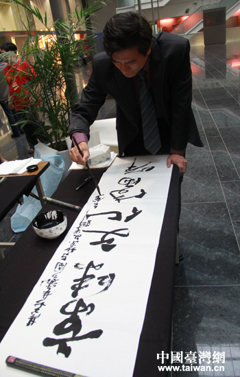 台中书法家苏仁彦用“京味文化传两岸台式风情两岸馨”寄语京台文化交流。(中国台湾网 高斯斯 摄)