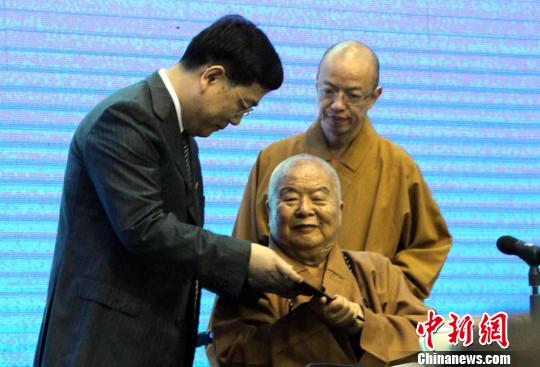 在随后举行的受聘仪式上,赵跃宇为星云大师颁发聘书、佩戴校徽。赵跃宇说,星云大师以望九之年受聘湖南大学名誉教授,将成为该校学术生活的一件盛事,为湖南大学扎根中国办好具有中国特色的高水平大学增添福慧、广结善缘。
