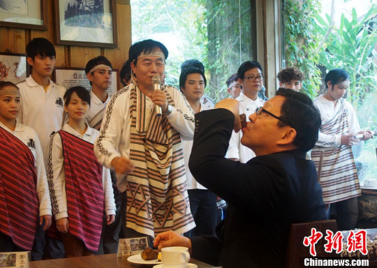 12月10日,海峡两岸关系协会会长陈德铭率“海协会经贸交流团”到访花莲太鲁阁公园,并应邀喝下台湾少数民族的特色小米酒。中新社发 郑巧 摄