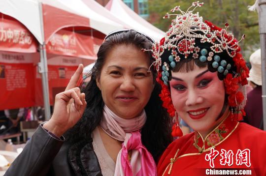 2月20日,在台中市举办的第五届海峡两岸春节民俗庙会上,台湾戏迷追到幕后与豫剧名角魏俊英合影留念。 李贵刚 摄