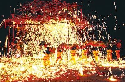 2月17日,确山县民间艺人手舞龙灯穿梭在飞溅的铁花之中,迎接农历羊年的到来。确山铁花曾一度濒危,上世纪七八十年代,经过当地文化工作者抢救性挖掘,使之成为全国第二批非物质文化遗产项目。李璞 摄