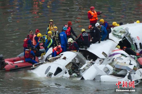 资料图:2月4日上午,搭载58人的台湾复兴航空GE-235班机从台北松山机场起飞后不久坠入基隆河。图为当地救援人员在空难现场实施救援。中新社发 邵航 摄