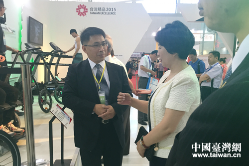 “台湾精品馆”中,展商介绍产品详情。(中国台湾网 张洁 摄)