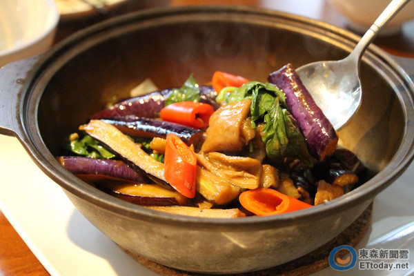 富锦树台菜香槟的塔香茄肠煲。(图/黄士原摄)