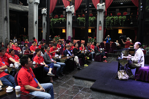 研习营一行首先参观了武侯祠与锦里。在武侯祠,来自四川大学历史文化学院的著名三国历史文化专家方北辰为营员们上了一堂特殊的“商业课”。方教授以《诸葛亮出山之谜》为题,从商业运作、人才培养等角度重新解读了“刘备三请诸葛亮”这一大家耳熟能详的历史故事,给营员们带来了不一样的三国文化体验。方教授讲完后,意犹未尽的营员们踊跃提问,与方教授热情互动,现场掌声、欢笑声络绎不绝。