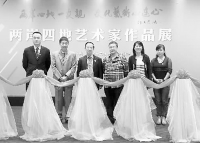 由台盟中央与港澳台美协、北京市台联共同主办的“两岸四地艺术家作品展示周”9月29日在北京台湾会馆开幕,展出了刘大为、覃志刚、李沃源、徐嘉炀等名家的近90幅书画精品和40多件雕塑作品。图为剪彩仪式。
