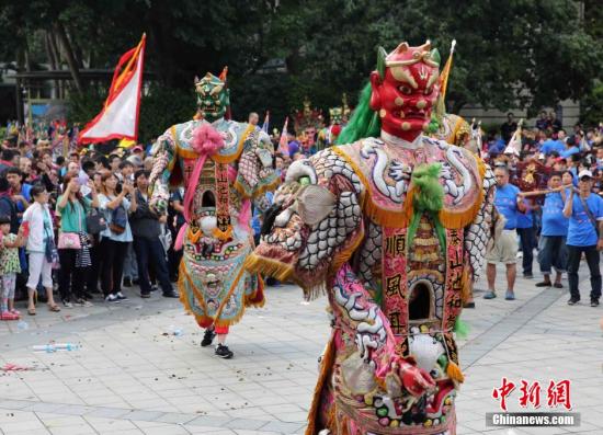 10月25日,多个民间团体在台北中山堂、凯达格兰大道等地举办庆祝台湾光复70周年活动。其中,中华统一促进党在中山堂广场祭祀两岸抗日烈士英灵,祈愿两岸和平团圆,并结合各地民间信仰团体在传统老城区举办巡游活动。中新社记者 任海霞 摄