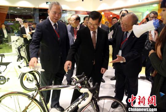 台湾商品中心1日在上海自贸试验区正式揭牌营运,两岸企业家峰会大陆方理事长曾培炎、台湾方理事长萧万长等嘉宾参观中心。 潘索菲 摄