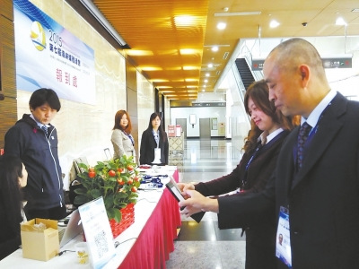 参会嘉宾只要用手机扫下二维码,就可以直接获取会议资料。(李向娟 摄)