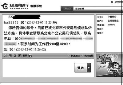 小王提供给北青报记者的华夏银行客服系统的回复中显示:“您所咨询的账号,目前已被北京市公安局刑侦总队依法冻结,具体事宜请联系北京市公安局刑侦总队”。