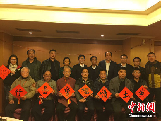 图为陈逢显(前排左3)与甘肃庆阳文博参访团成员合影。前排左4为团长阎晓峰。全体人员手持书法家现场所写春联,有迎接新年到来的温馨气氛。