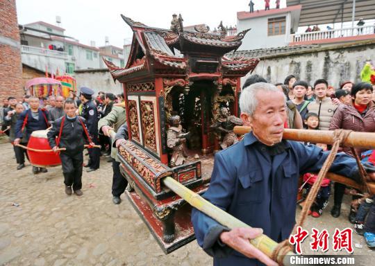 图为老人们抬着五谷真仙走进祖祠,祈祷风调雨顺。 黄水林 摄