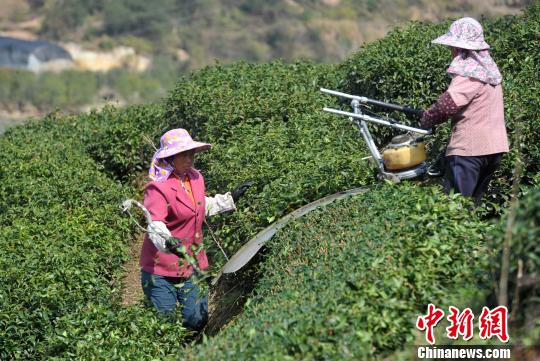 图为鸿鼎的茶叶生产基地,工人忙着剪枝。 张斌 摄
