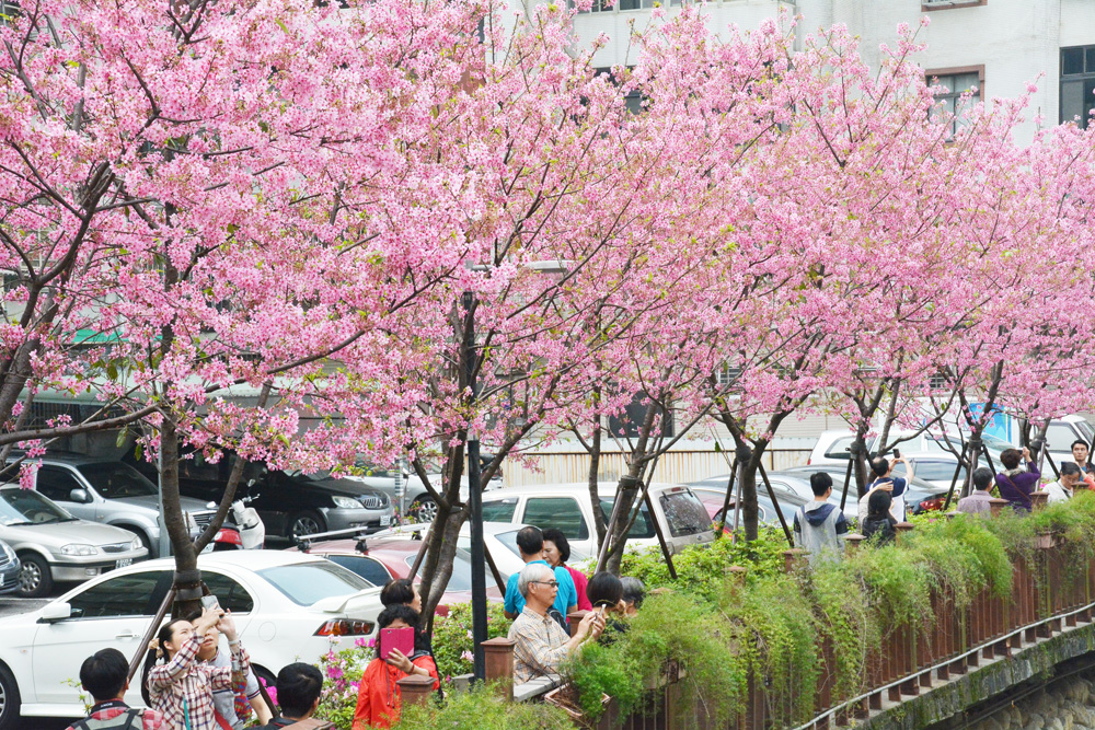 图:新北市土城区“希望之河”广场,为新北市内难得可坐捷运赏樱花的景点,五日挤满赏樱人潮,民众纷纷拿手机、相机与粉红佳人一起留影。(图片来源:台湾“中央社”)