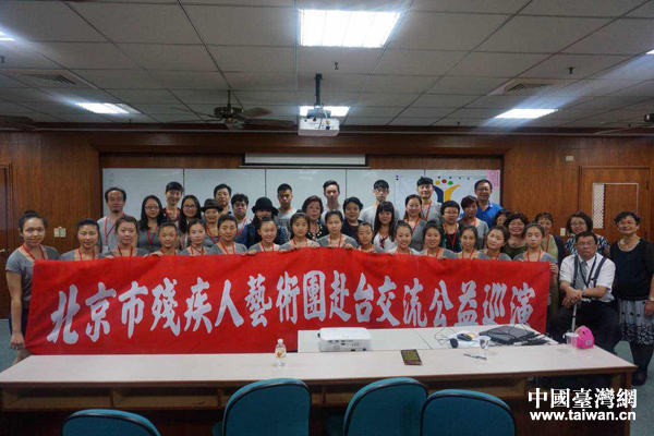 北京市残疾人艺术团参加交流座谈并合影留念。(中国台湾网 雍紫薇 摄)