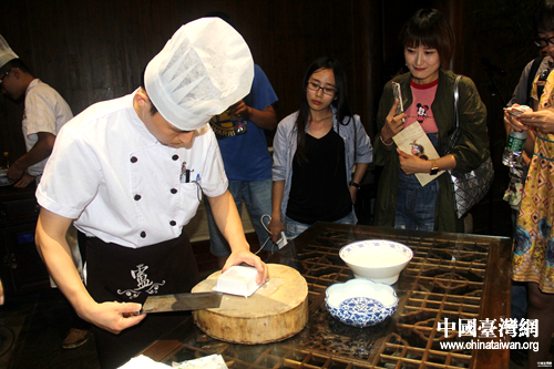 中国淮扬菜博物馆的厨艺大师展示切豆腐刀工。(中国台湾网记者 李杰 摄)