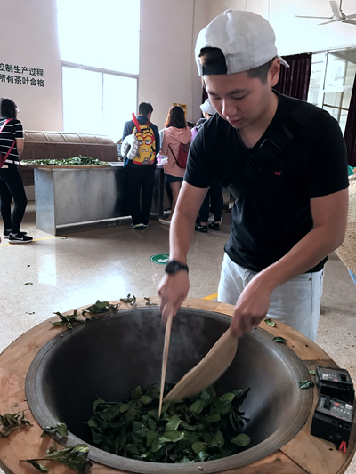 炒茶不容易,火候难掌握。华侨大学就读的台湾学生聂耀庭试着炒茶。