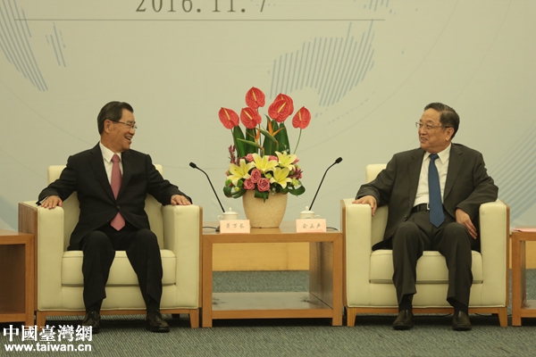 7日下午,中共中央政治局常委、全国政协主席俞正声在厦门会见前来参加2016两岸企业家峰会年会的台湾方面理事长萧万长。(中国台湾网 扶海涛 摄)