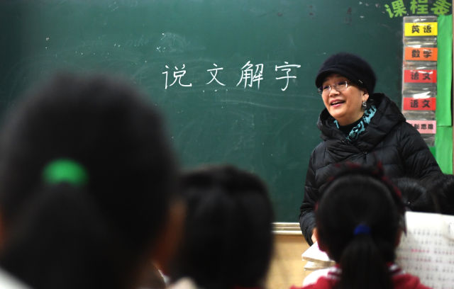 萧永瑞为武汉外国语学校美加分校的学生们上国学课。(新华社记者程敏摄)