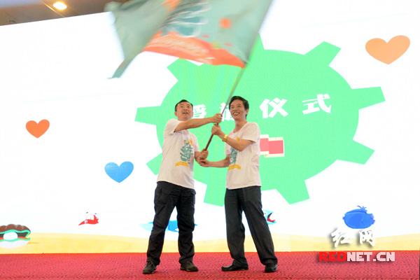 湖南省政府台湾事务办公室主任冯波(右)和湖南广播电视台副台长胡卫箭(左)授旗。