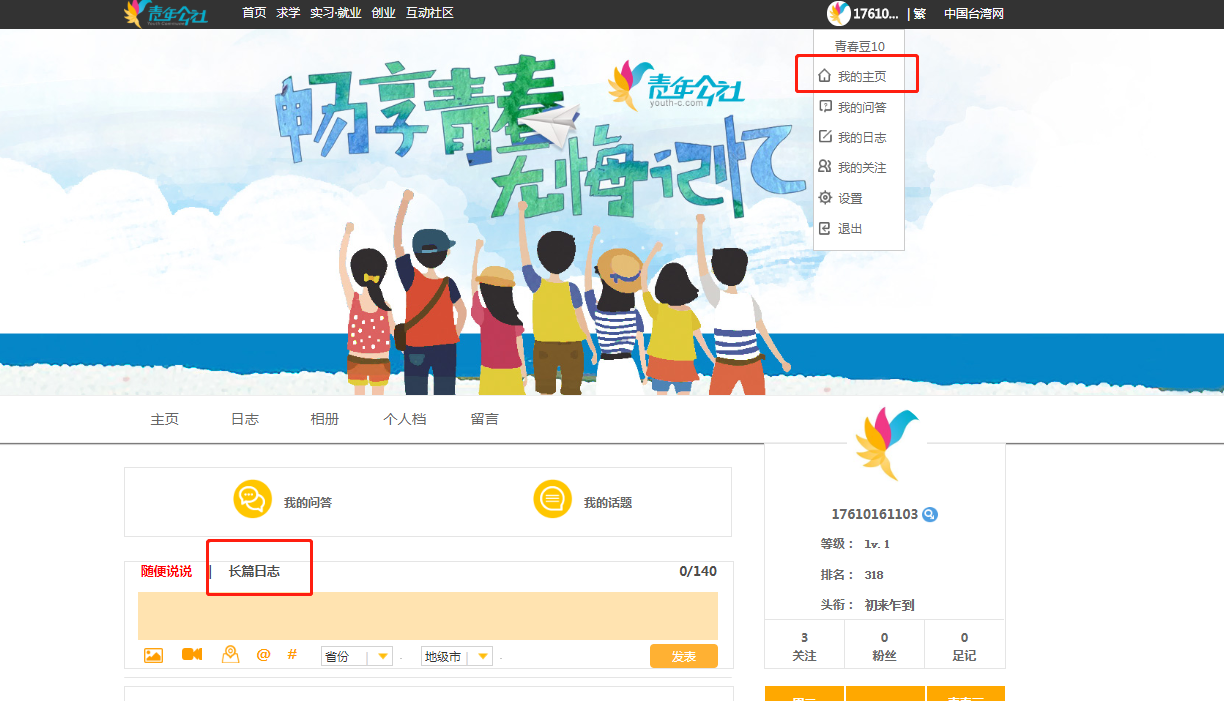 1.在电脑上(划重点:电脑上)打开青年公社(http://y.taiwan.cn),使用邮箱或者手机号码进行注册,成为青年公社尊贵会员!然后登录“个人主页”发表“长篇日志”。